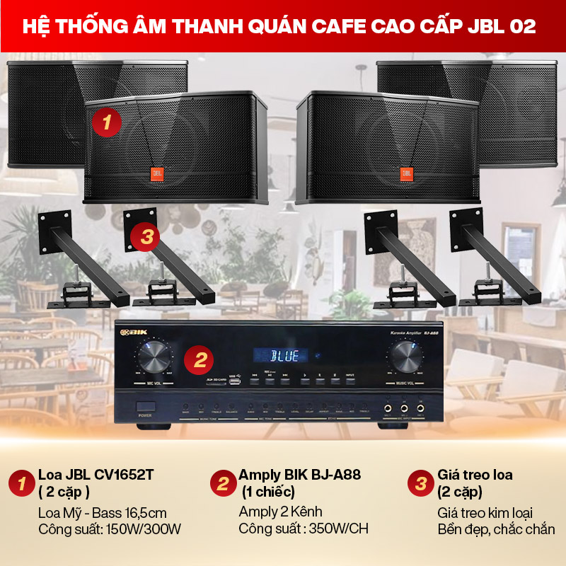 Hệ thống âm thanh Quán cafe cao cấp JBL 02 được đội ngũ kỹ thuật viên phối ghép phù hợp, chất lượng từ các thiết bị âm nhạc đến từ thương hiệu đình đám JBL, BIK, đáp ứng mọi nhu cầu sử dụng trong không gian giải trí 100-130m2.