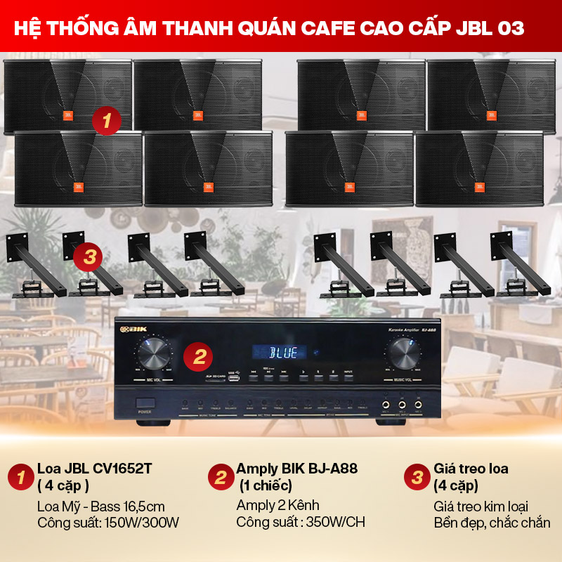 Hệ thống âm thanh Quán cafe cao cấp JBL 03 được đội ngũ kỹ thuật viên phối ghép phù hợp, chất lượng từ các thiết bị âm nhạc đến từ thương hiệu đình đám JBL, BIK, đáp ứng mọi nhu cầu sử dụng trong không gian giải trí 150-200m2.