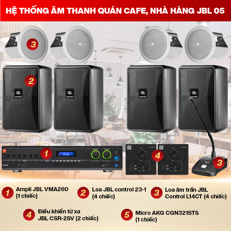 Cấu hình Hệ thống âm thanh quán cafe, nhà hàng JBL 05 gồm: