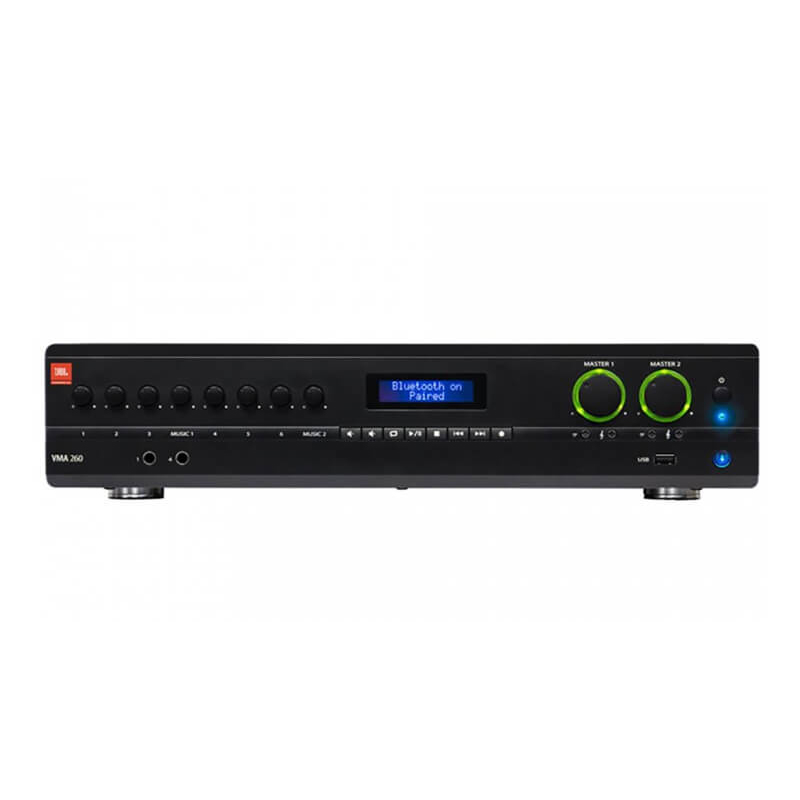 JBL VMA 260 phát nhạc không dây qua Bluetooth hoặc cắm ổ USB vào cổng USB Type-A trên bảng điều khiển phía trước của Amply. VMA 260 được JBL tích hợp chức năng điều khiển âm lượng từ xa thông qua mô-đun JBL CSR-V hoặc cáp Ethernet tiêu chuẩn.