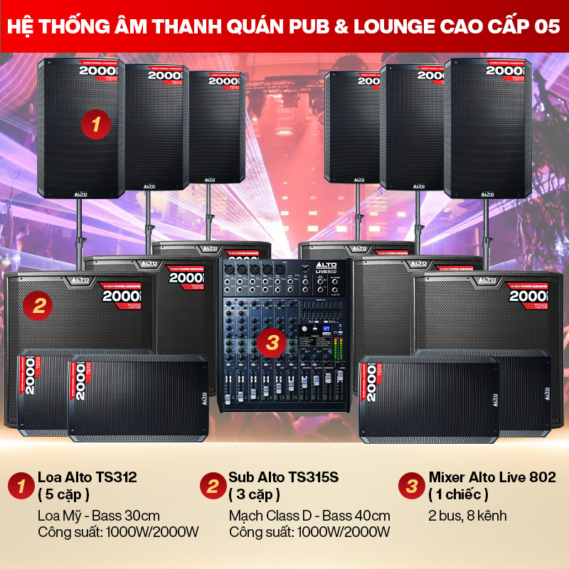 Hệ thống âm thanh quán PUB & Lounge cao cấp 05 chính hãng, mạnh mẽ gây ấn tượng mạnh cho tất cả các tín đồ âm nhạc, được phối ghép phục vụ nhu cầu âm nhạc không gian giải trí lớn, phù hợp sử dụng ở các quán cafe, phòng trà có diện tích 300m2.