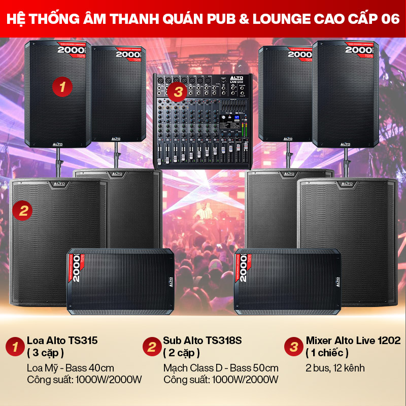 Hệ thống âm thanh quán PUB & Lounge cao cấp 06 được Bảo Châu Elec cẩn thận phối ghép từ các thiết bị âm nhạc chính hãng của thương hiệu Alto đình đám, mang đến khả năng chinh phục tất cả các khách hàng.