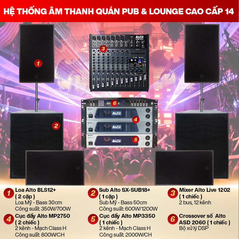Hệ thống âm thanh quán PUB & Lounge cao cấp 14 được phối ghép từ các thiết bị âm nhạc chính hãng, hứa hẹn mang đến cho người dùng trải nghiệm âm nhạc tuyệt vời, phù hợp với không gian giải trí 100m2.