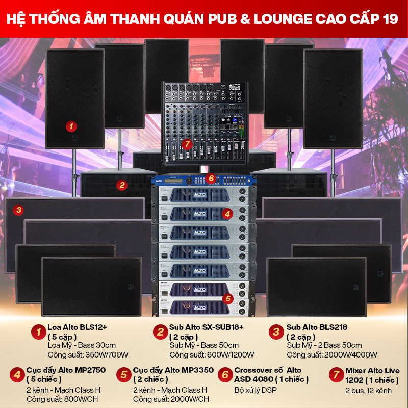 Hệ thống âm thanh quán PUB & Lounge cao cấp 19 được phối ghép từ các thiết bị âm nhạc chính hãng của thương hiệu Alto đình đám, hứa hẹn mang đến cho người dùng trải nghiệm âm nhạc tuyệt vời, phù hợp không gian 200m2.