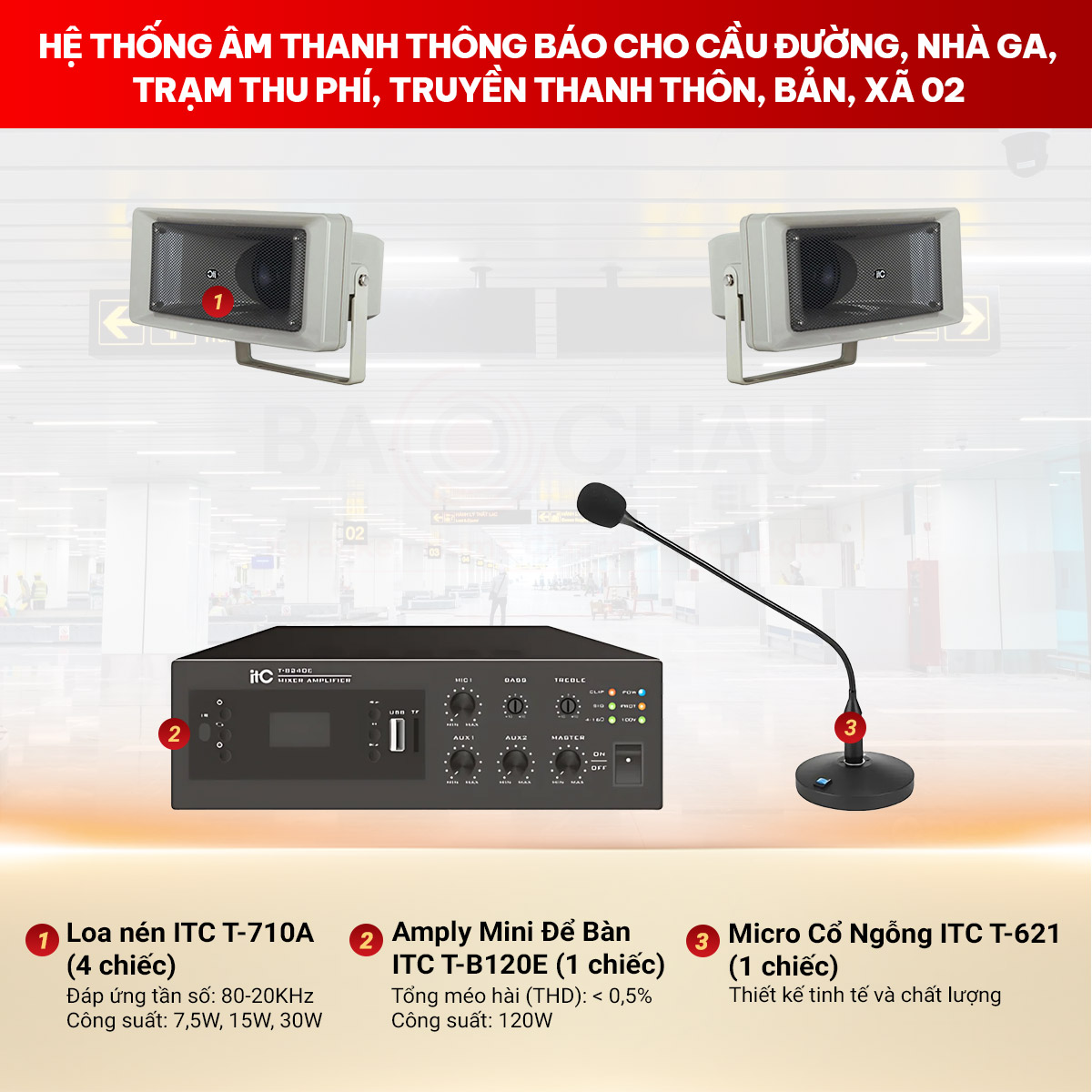 Trong các không gian công cộng như cầu đường, nhà ga, trạm thu phí, thôn xóm hay trụ sở xã, một hệ thống âm thanh thông báo chuyên nghiệp là vô cùng cần thiết để đảm bảo việc truyền tải thông tin nhanh chóng, rõ ràng và hiệu quả. Đáp ứng nhu cầu đó, Bảo Châu Elec giới thiệu Hệ thống âm thanh thông báo cho cầu đường, nhà ga, trạm thu phí, truyền thanh thôn, bản, xã 02, được phối ghép từ các thiết bị ITC cao cấp, bền bỉ và dễ dàng vận hành. Hệ thống bao gồm: loa nén ITC T-710A, amply kỹ thuật số ITC T-B120E và micro cổ ngỗng ITC T-621A. Sự kết hợp này mang đến giải pháp thông báo rõ ràng, phủ âm rộng và đảm bảo tín hiệu ổn định trong nhiều môi trường khác nhau.