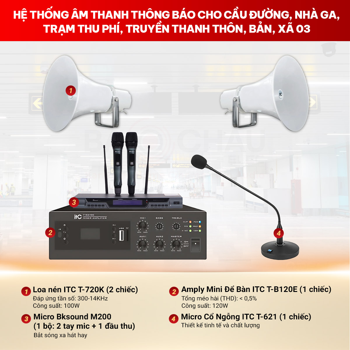 Hệ thống âm thanh thông báo cho cầu đường, nhà ga, trạm thu phí, truyền thanh thôn, bản, xã 03 là giải pháp hoàn hảo cho các khu vực công cộng cần truyền tải thông tin nhanh chóng, rõ ràng và ổn định như cầu đường, nhà ga, trạm thu phí, thôn bản, xã. Với sự kết hợp của loa nén ITC T-720K công suất lớn, amply kỹ thuật số ITC T-B120E mạnh mẽ, micro cổ ngỗng ITC T-621A tiện dụng và micro không dây Bksound M200 linh hoạt, hệ thống mang đến hiệu quả vận hành vượt trội, phù hợp nhiều nhu cầu sử dụng thực tế.
