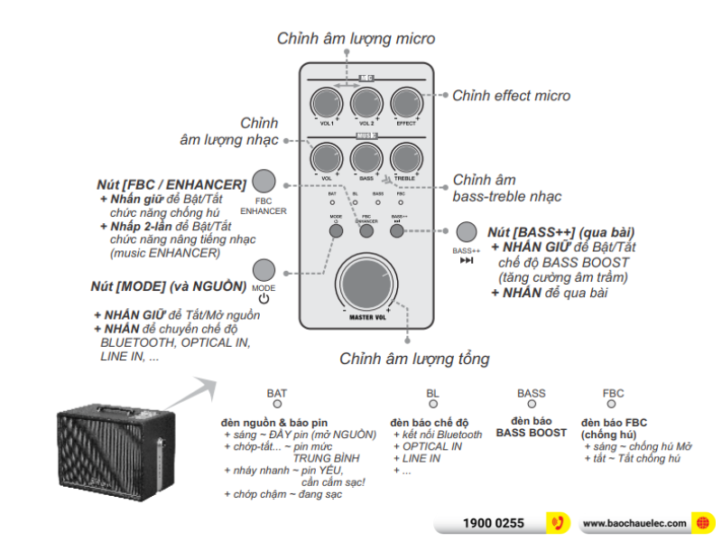 - Nên chỉnh MASTER VOL ở mức vừa phải, sau đó tinh chỉnh riêng MIC và MUSIC để đạt hiệu quả tốt nhất.