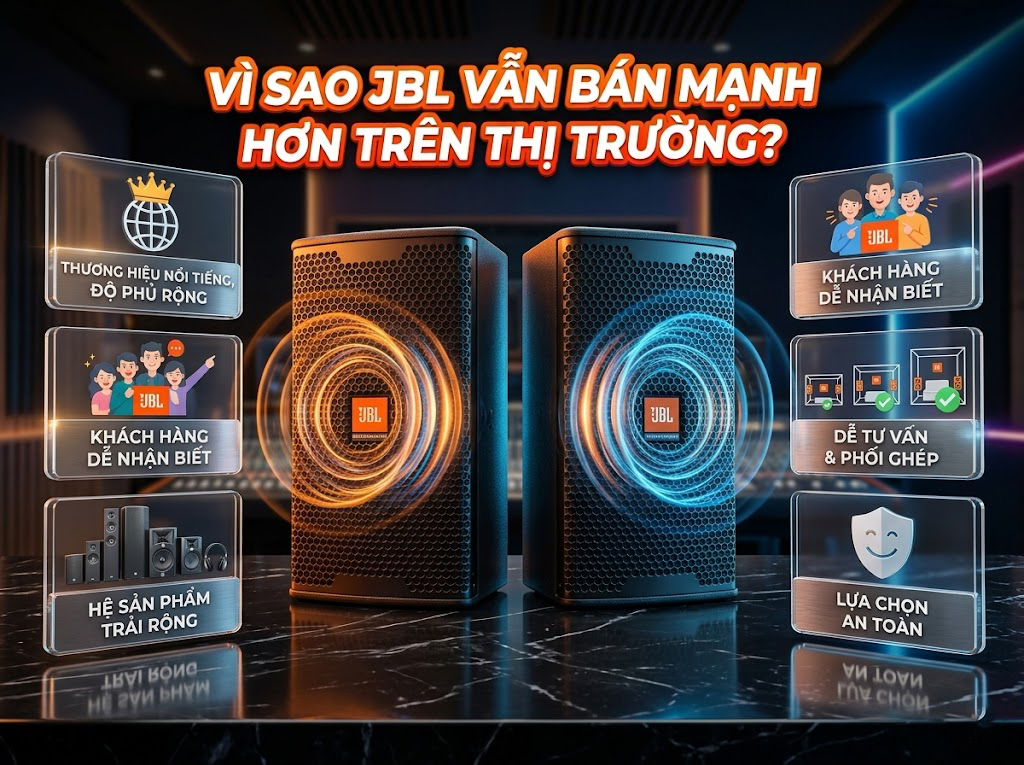 Ở góc độ bán hàng, đây là điều mà gần như anh em nào làm showroom cũng hiểu rất rõ. Khách đi mua loa mà gặp một cái tên quen, tâm lý xuống tiền thường nhẹ hơn nhiều. Không ít trường hợp chưa cần nghe quá sâu, chỉ riêng yếu tố thương hiệu đã đủ để nghiêng cán cân lựa chọn. Đó là lý do JBL vẫn giữ được sức bán rất mạnh trong rất nhiều tình huống, đặc biệt với nhóm khách mua lần đầu hoặc muốn chọn một phương án ít rủi ro.