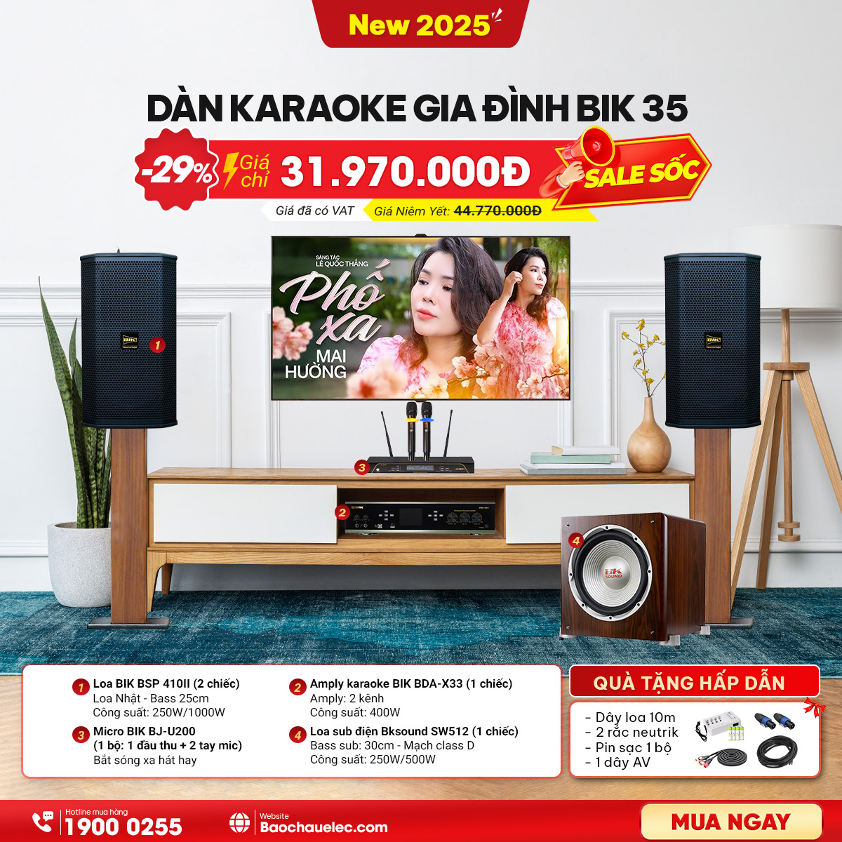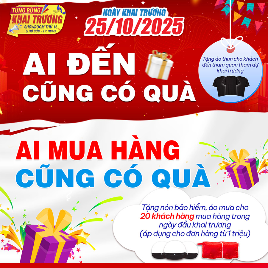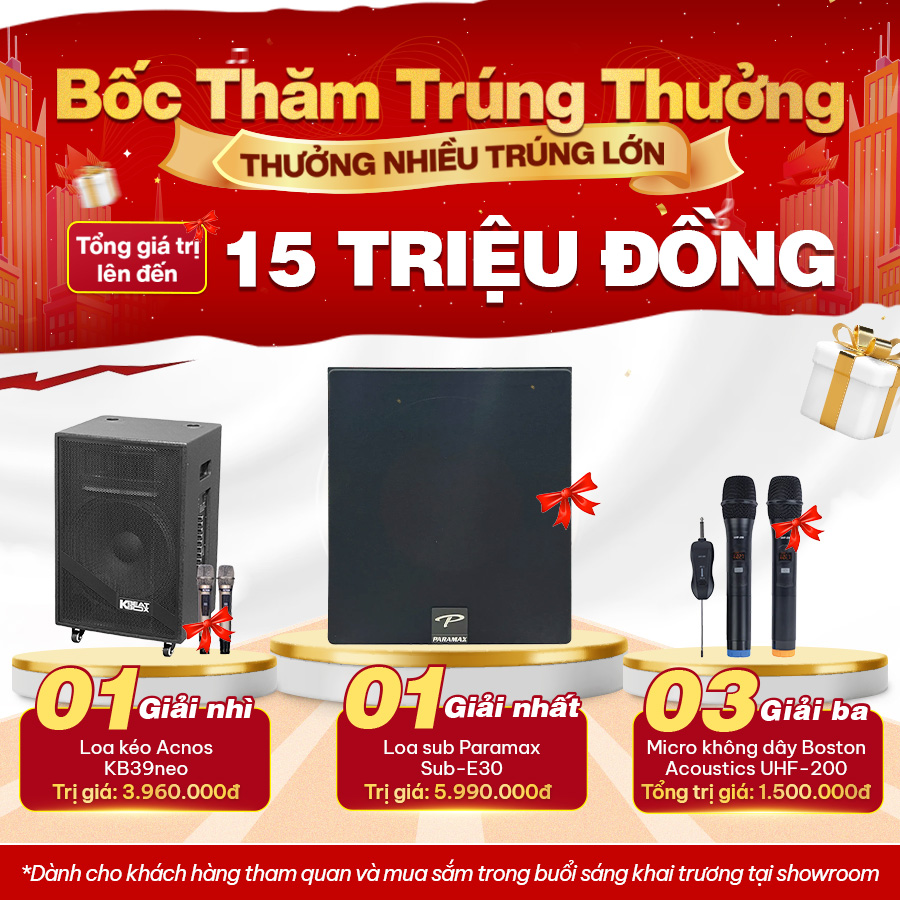 Trong ngày khai trương, khi mua sắm bất kỳ thiết bị âm thanh từ 1 triệu đồng trở lên, khách hàng sẽ được giảm giá trực tiếp và tặng kèm nhiều phần quà giá trị như áo mưa, mũ bảo hiểm, phụ kiện âm thanh... Số lượng quà tặng có hạn, hãy đến sớm để không bỏ lỡ cơ hội!