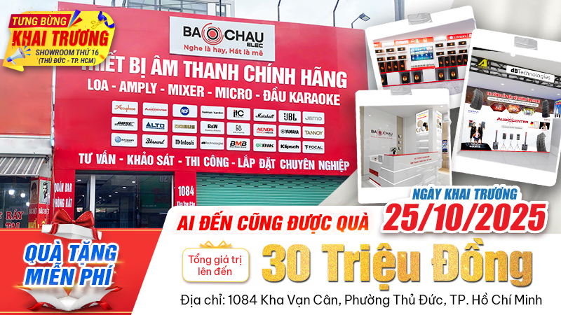 Tưng bừng khai trương showroom thứ 16 của Bảo Châu Electại Thủ Đức! Sự kiện đánh dấu bước mở rộng mạnh mẽ của hệ thống âm thanh hàng đầu Việt Nam, mang đến cho khách hàng không gian trải nghiệm thiết bị âm thanh cao cấp, hiện đại và quy mô bậc nhất TP.HCM. Đặc biệt, trong ngày khai trương nhiều chương trình khuyến mại hấp dẫn cùng hàng trăm phần quà tri ân giá trị lên tới 30 triệu đồng.