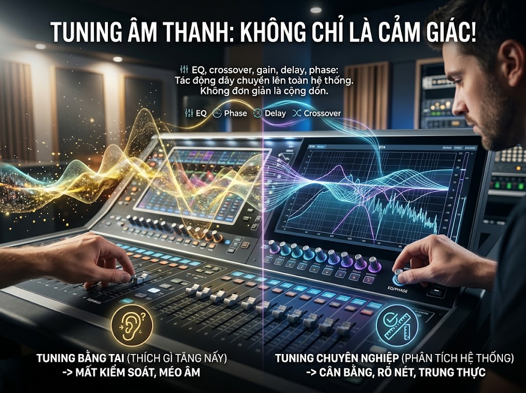 Người có kinh nghiệm sẽ không tuning theo kiểu chữa cháy. Họ đi theo đúng trình tự: kiểm tra kết nối, kiểm tra cực tính, thiết lập gain, phân dải tần, căn phase, căn delay, sau đó mới xử lý EQ và tinh chỉnh theo mục tiêu nghe thực tế. Làm đúng thứ tự, hệ thống sẽ ổn định, dễ kiểm soát và giữ được chất lượng khi vận hành lâu dài.