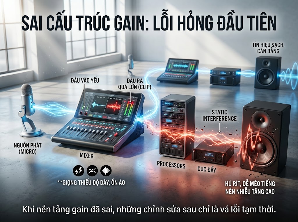 Một hệ thống âm thanh muốn tuning chuẩn thì trước hết phải có mức tín hiệu sạch, đủ headroom và phân bổ hợp lý từ nguồn phát, mixer hoặc vang số, processor, đến power amplifier và loa. Khi nền tảng gain đã sai, những chỉnh sửa phía sau chỉ là vá lỗi tạm thời.