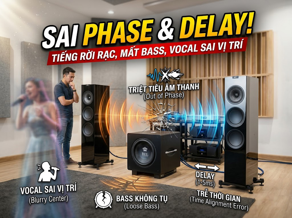 Có những bộ dàn nhìn cấu hình rất đẹp, thiết bị không hề rẻ, nhưng khi nghe lại thấy tiếng rời rạc, bass không tụ, vocal không ngồi đúng vị trí. Nguyên nhân rất thường gặp là lệch phase hoặc delay chưa chuẩn.