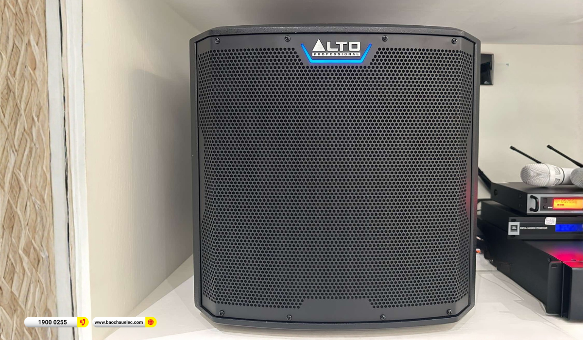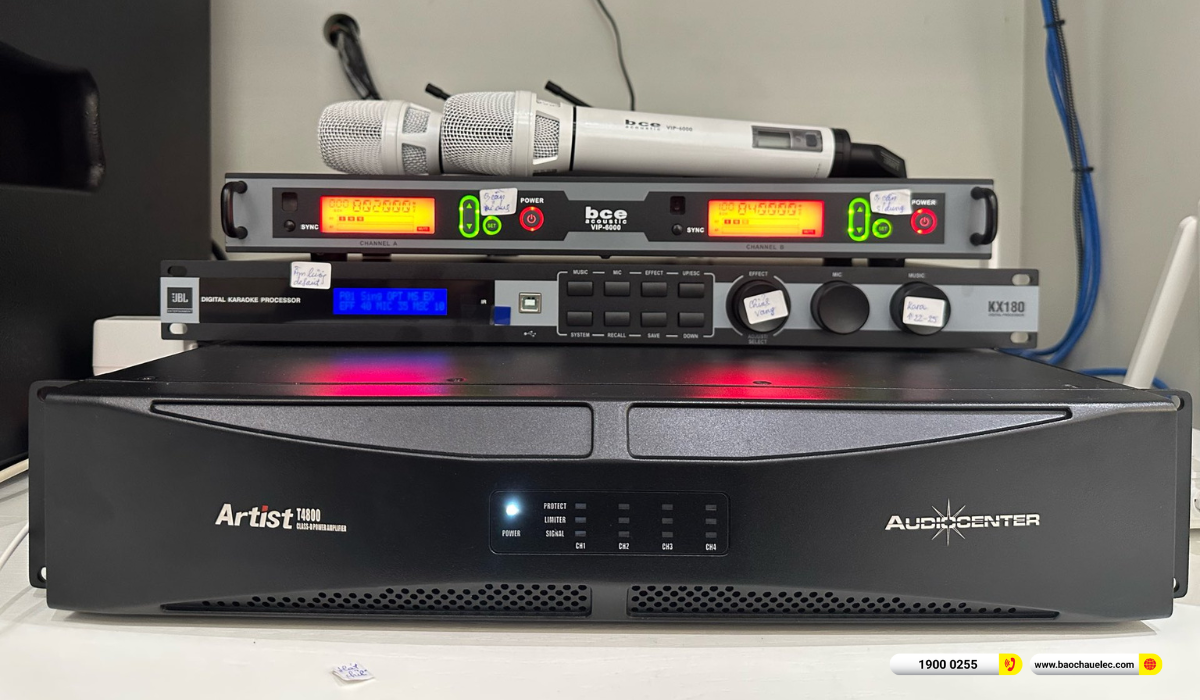 Cấu hình hệ thống nổi bật với loa cột di động gắn tường Audiocenter Artist T43 (2 chiếc), cho khả năng phủ âm rộng, tiếng hát rõ và cân bằng. Âm thanh được khuếch đại mạnh mẽ, ổn định nhờ cục đẩy 4 kênh Audiocenter Artist T4800, kết hợp vang số JBL KX180A giúp xử lý giọng hát mượt mà, hạn chế hú rít hiệu quả. Phần âm trầm được đảm nhiệm bởi loa sub điện Alto TS12S, mang đến tiếng bass sâu, chắc nhưng không lấn dải trung.