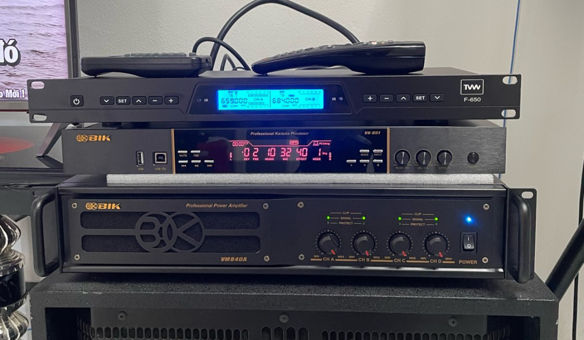 Cục đẩy công suất BIK VM 840A - Thiết bị 4 kênh, cho khả năng khuếch đại mạnh mẽ, đảm bảo công suất đủ tải cho hệ thống loa, giữ âm thanh sạch và không bị méo tiếng khi hát lớn. Vang số BIK VK-R51 (1 chiếc): Cho phép căn chỉnh âm thanh chuyên sâu, tích hợp nhiều chế độ reverb, echo hiện đại. Đặc biệt, vang có khả năng chống hú hiệu quả – yếu tố quan trọng trong dàn karaoke gia đình.