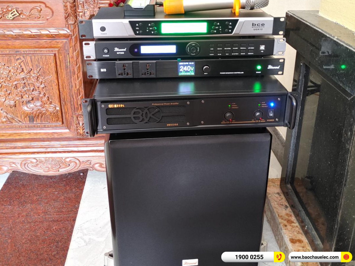 Đảm nhiệm xử lý tín hiệu là vang số Bksound KP500, cho phép tinh chỉnh âm thanh chuyên sâu, mang lại chất giọng trong trẻo, cân bằng và đầy cảm xúc. Bên cạnh đó, loa sub điện Bksound SW512 giúp tăng cường dải trầm uy lực, tạo chiều sâu cho không gian nghe, hát.