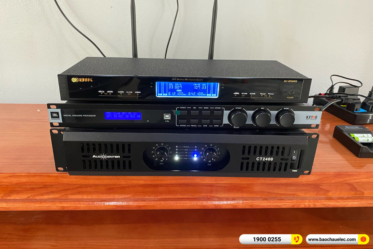 Về cấu hình, hệ thống sử dụng 2 loa karaoke dBTechnologies LVXP15 với công suất lớn, khả năng tái tạo âm thanh rõ ràng, tiếng hát dày và sáng, đặc biệt phù hợp với những không gian cần độ phủ âm tốt. Khuếch đại cho toàn bộ hệ thống là cục đẩy công suất 2 kênh Audiocenter CT2400, nổi bật với lực đánh khỏe, hoạt động ổn định, giúp loa phát huy tối đa hiệu suất mà vẫn giữ âm thanh sạch, chắc tiếng. Phần xử lý tín hiệu trung tâm được giao cho vang số JBL KX190, cho phép tinh chỉnh echo, reverb chi tiết, hỗ trợ chống hú rít hiệu quả, mang lại giọng hát mượt và dễ kiểm soát.