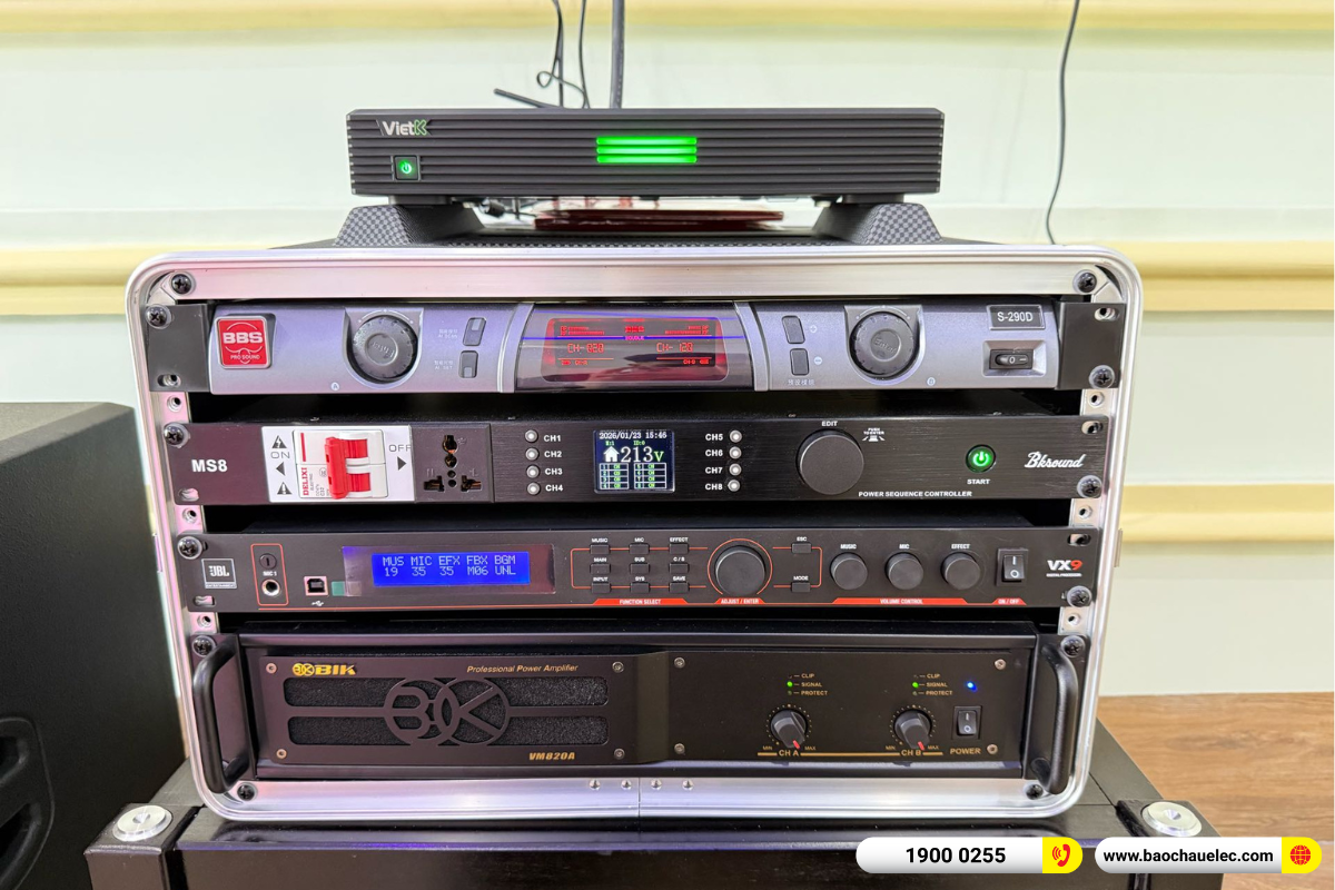 Khâu xử lý âm thanh được đảm nhiệm bởi vang số JBL VX9, giúp tinh chỉnh giọng hát mượt mà, kiểm soát hú rít hiệu quả, mang lại cảm giác dễ hát và chuyên nghiệp cho người sử dụng. Phần âm trầm được bổ sung bằng loa sub điện BIK BBK-W55A, cho tiếng bass sâu, uy lực, tạo không khí sôi động cho nhạc xuân, nhạc remix hay những màn trình diễn đầy cảm xúc đầu năm mới.