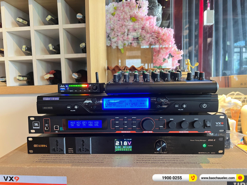 Khâu xử lý chuyên sâu được đảm nhiệm bởi vang số JBL VX9, cho khả năng tinh chỉnh giọng hát mượt, dày, chống hú hiệu quả và phù hợp nhiều thể loại nhạc. Micro không dây Baiervires BS-9800 bắt giọng nhạy, sóng ổn định, giúp người hát tự tin trong quá trình trình diễn. Toàn bộ thiết bị được vận hành an toàn, đồng bộ nhờ quản lý nguồn BIK BSQ-8, góp phần tăng độ bền và hạn chế rủi ro về điện.