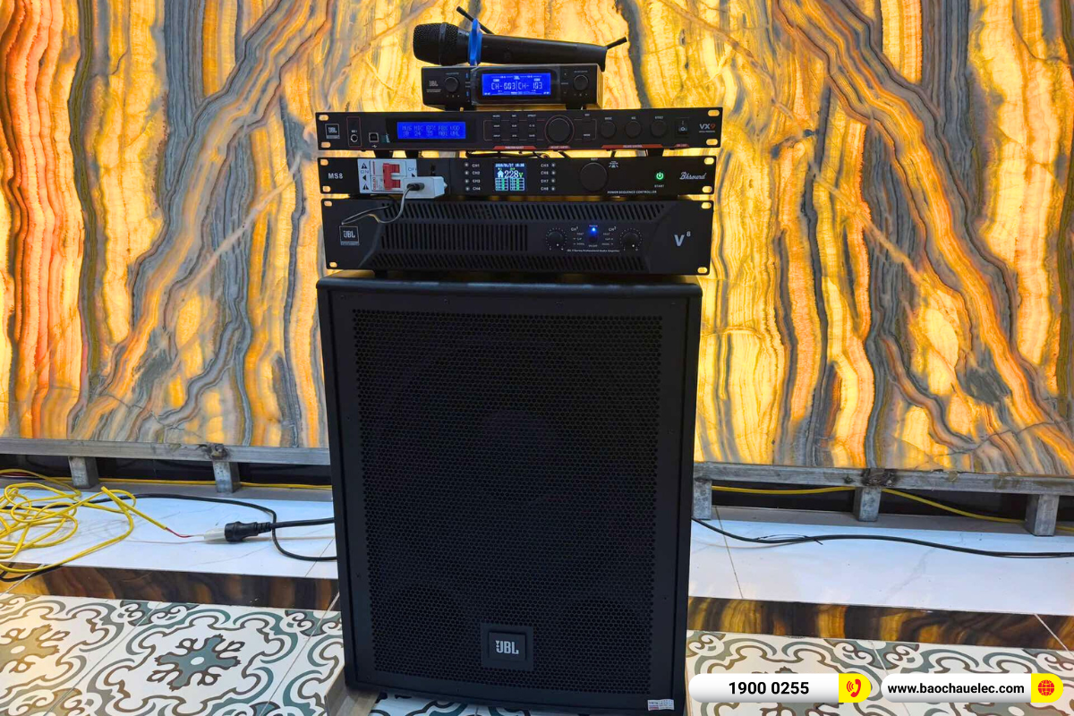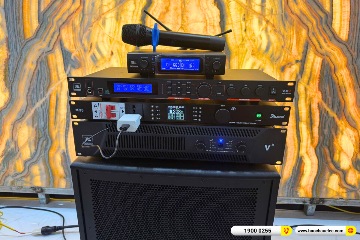 Bộ dàn được phối ghép hoàn chỉnh từ các thiết bị JBL chính hãng, nổi bật với loa karaoke JBL CV1270 cho tiếng hát dày, rõ nét; cục đẩy công suất JBL V8 mạnh mẽ, đánh loa căng đầy; vang số JBL VX9 xử lý âm thanh mượt mà, dễ căn chỉnh.