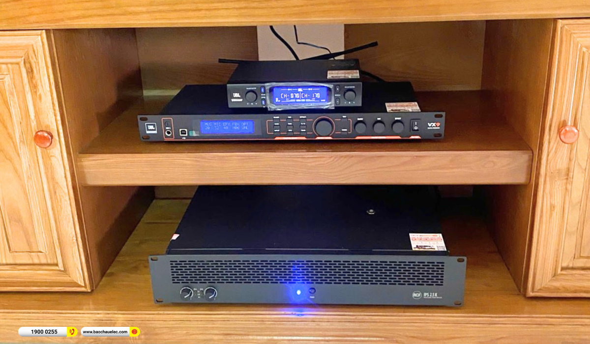 Phần xử lý và hoàn thiện âm thanh được đảm nhiệm bởi vang số JBL VX9 cùng loa sub điện RCF 705-AS MK3 bass 40cm, cho tiếng trầm sâu, chắc và đầy lực. Sự kết hợp này giúp dàn karaoke vừa hát “đã”, vừa nghe nhạc sôi động, không gian phòng luôn có chiều sâu và độ lan tỏa tốt.