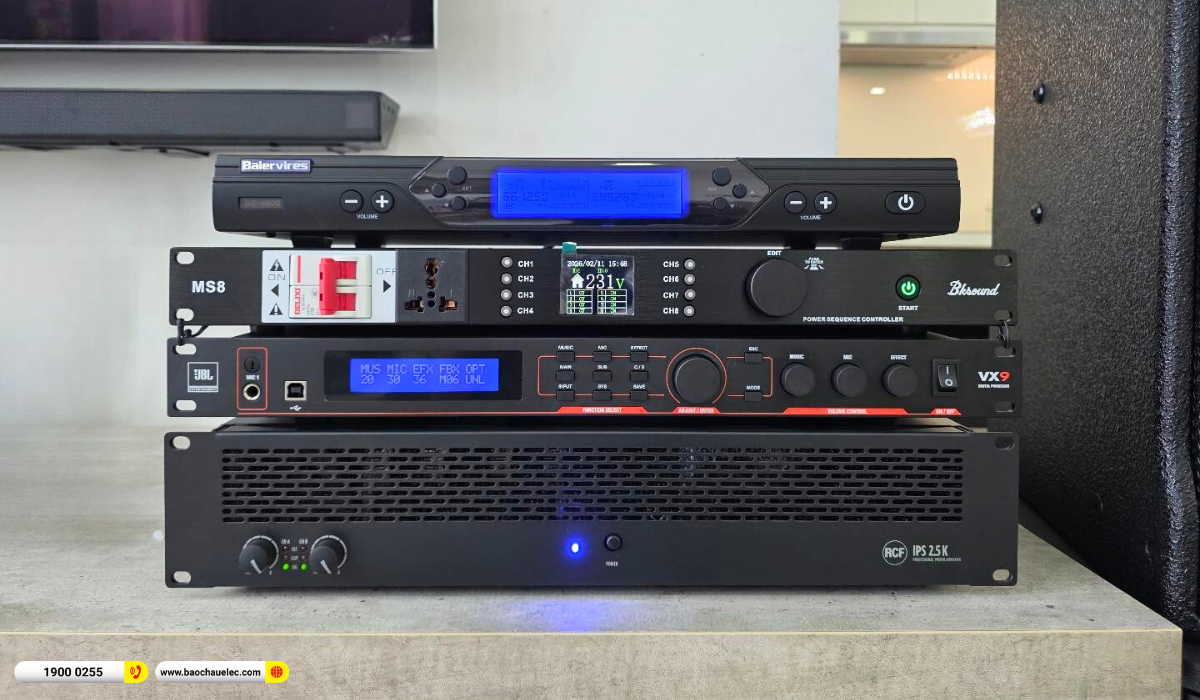 Bộ micro không dây Baiervires BS9800 đã góp phần hoàn thiện trọn vẹn bộ dàn này. Các thiết bị được bảo vệ bởi quản lý nguồn Bksound MS8, giúp hệ thống vận hành ổn định và bền bỉ lâu dài. Dựa trên hình ảnh thực tế, dàn máy được bố trí gọn gàng hai bên kệ TV, sub đặt cân đối, tổng thể vừa sang trọng vừa tối ưu hiệu suất, không chỉ là dàn karaoke gia đình mà là hệ thống giải trí cao cấp thể hiện gu thẩm mỹ và đẳng cấp của gia chủ.