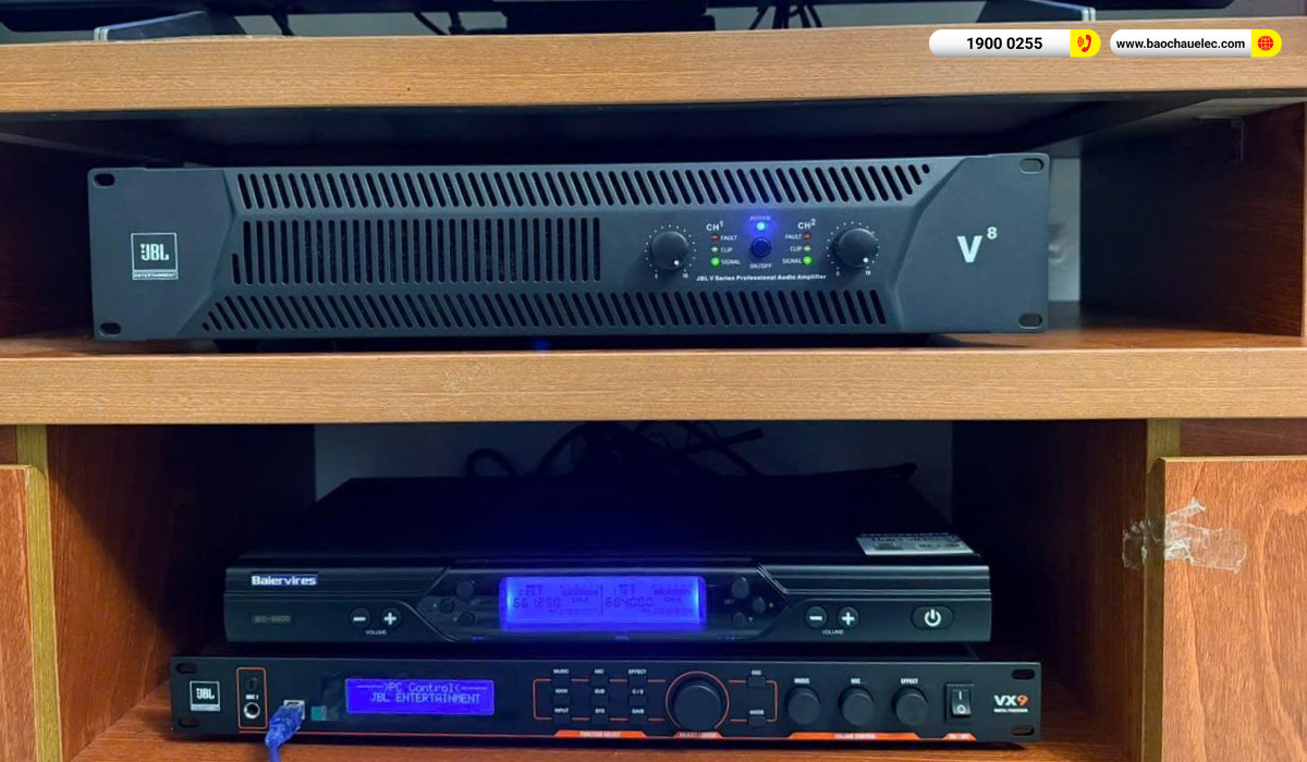 Để khuếch đại âm thanh, bộ dàn sử dụng cục đẩy 2 kênh công suất JBL V8, cung cấp công suất ổn định và mạnh mẽ. Thiết bị này giúp loa hoạt động tối ưu, loại bỏ hiện tượng méo tiếng và đảm bảo bass, mid, treble cân bằng, phục vụ hát karaoke hoặc nghe nhạc đều xuất sắc. Đi kèm là vang số JBL VX9, xử lý tín hiệu âm thanh chuyên nghiệp, cân bằng các dải âm và loại bỏ hú rít.