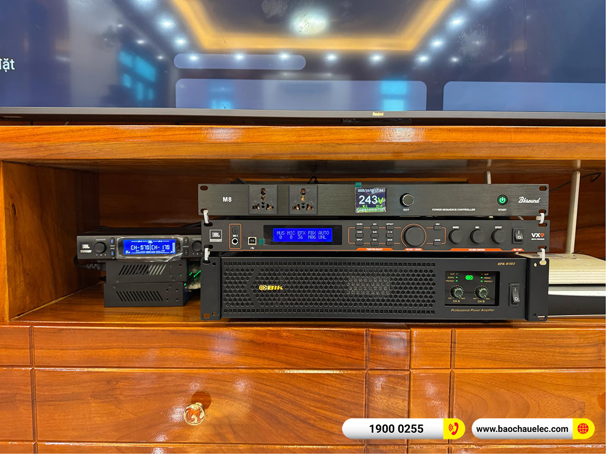 Hỗ trợ cho loa chính là cục đẩy công suất BIK BPA-H102 công nghệ Class H, công suất lên đến 1000W/2 kênh, đảm bảo khuếch đại mạnh mẽ, ổn định và chi tiết. Bộ xử lý trung tâm vang số JBL VX9 (phiên bản mới 2025) ứng dụng công nghệ DSP hiện đại, cho phép tinh chỉnh âm thanh chính xác, chống hú hiệu quả và tạo hiệu ứng echo, reverb tự nhiên, giúp giọng hát trở nên mềm mại và đầy cảm xúc.
