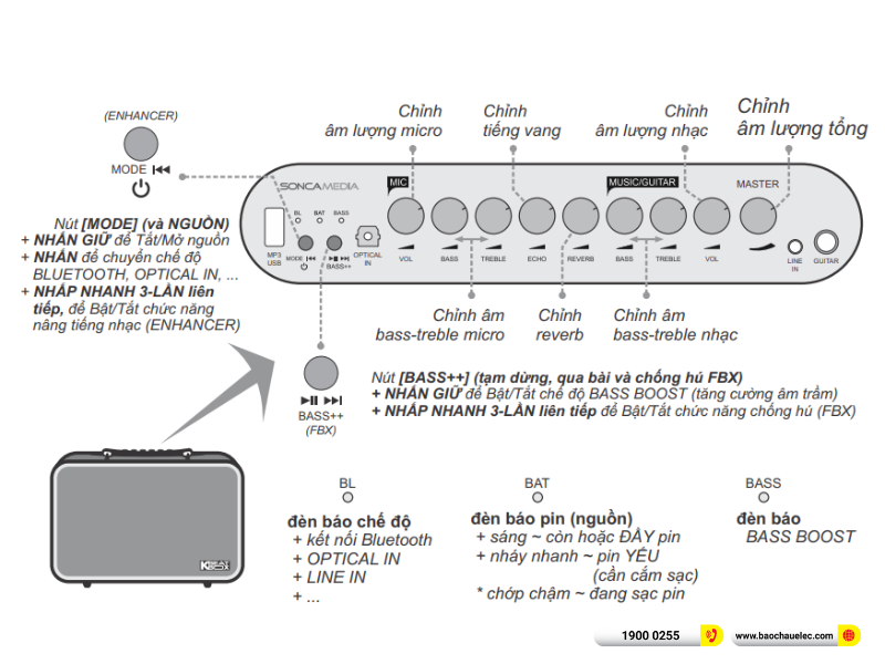 - Guitar (jack 6.35mm): kết nối nhạc cụ cho biểu diễn, tập luyện