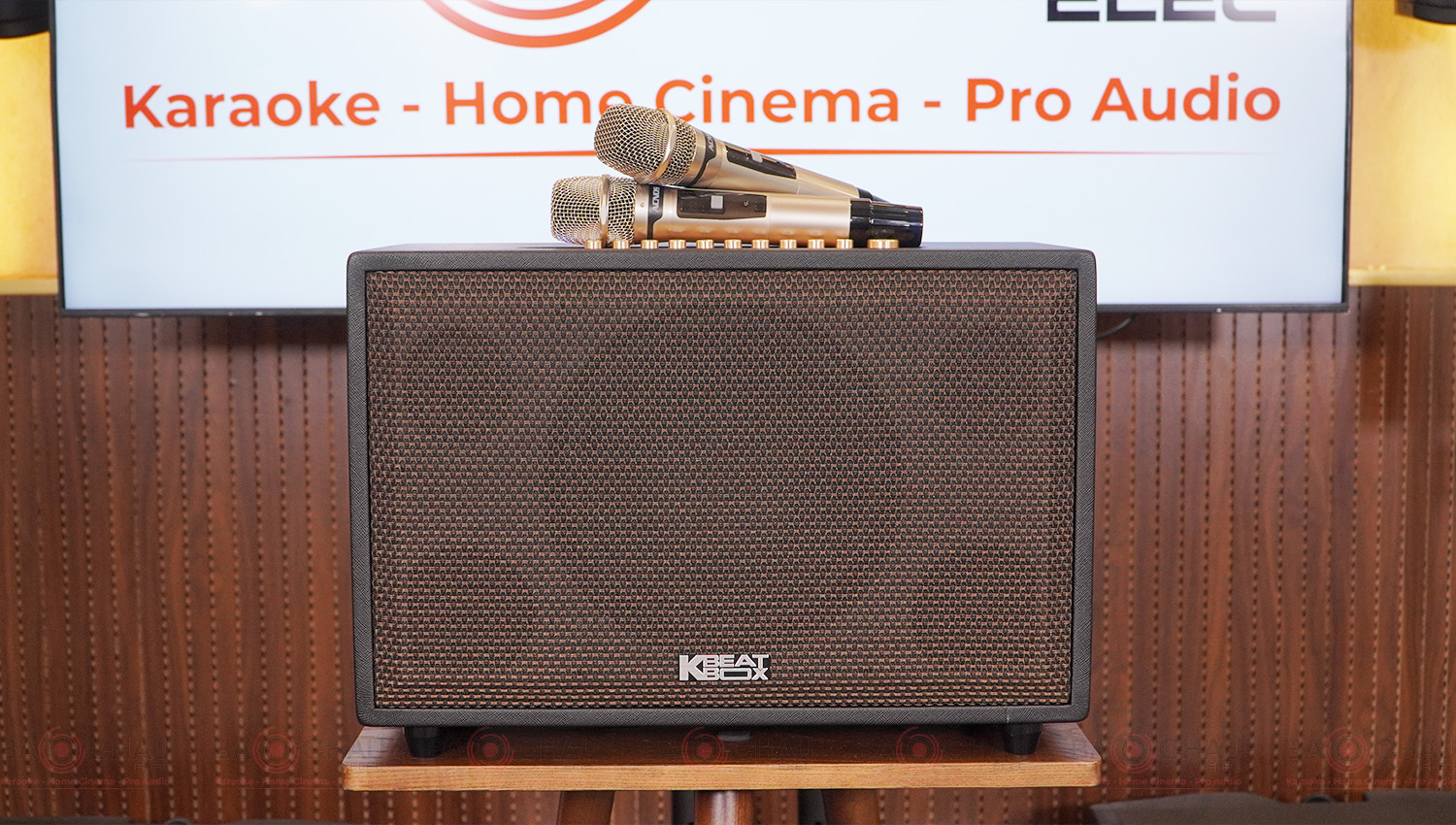 Điểm nhấn nổi bật là lưới thép cao cấp được bọc vải màu nâu trầm sang trọng, dễ hòa hợp với nhiều phong cách nội thất khác nhau. Lớp lưới này vừa tạo vẻ đẹp tinh tế, vừa giúp hạn chế bám bụi và giảm thiểu tác động va chạm nhẹ, bảo vệ tối ưu màng loa bên trong. Logo KBeatbox được đặt tinh tế ở góc dưới, tạo điểm nhận diện thương hiệu rõ ràng.