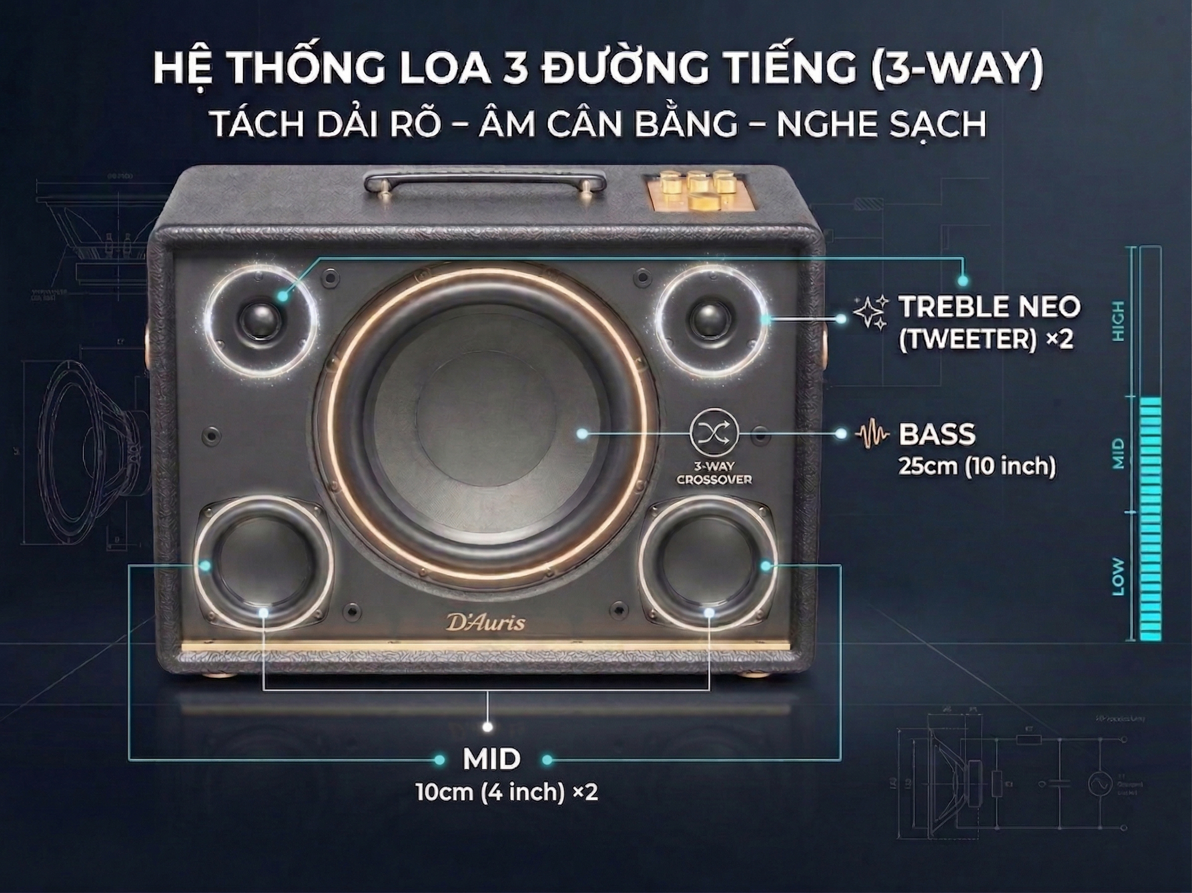 Ở dải trầm, D’Auris 300 sử dụng loa bass đường kính 25cm (10 inch), mang lại khả năng tái tạo âm trầm sâu, chắc và có lực. Bass xuống thấp nhưng vẫn kiểm soát tốt, không bị ù hay kéo đuôi, giúp những bản nhạc sôi động thêm phần mạnh mẽ và phần nhạc nền karaoke trở nên dày dặn hơn.