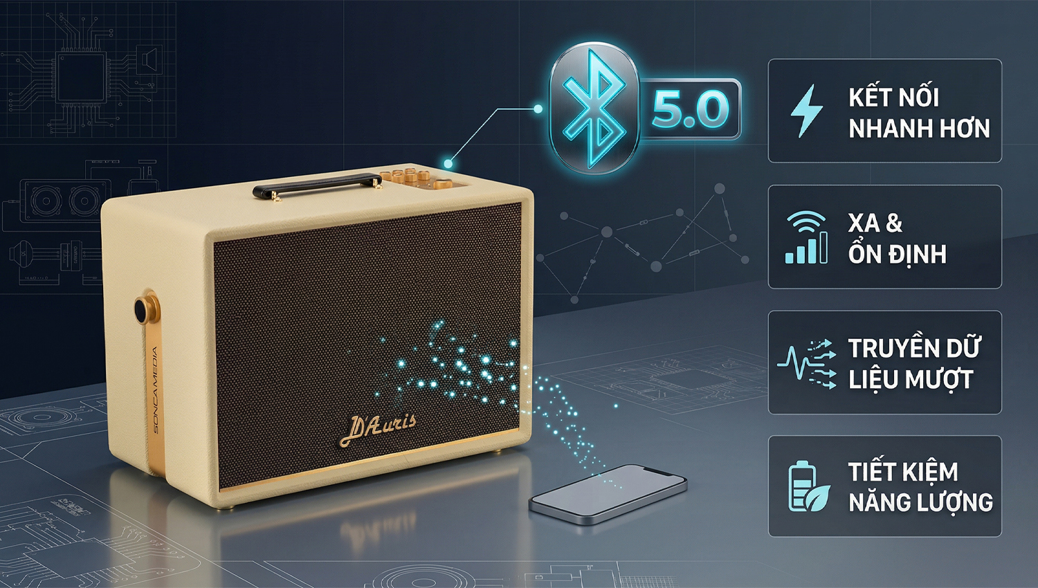 Bluetooth 5.0 cho khả năng tương thích tốt với các thiết bị phổ biến hiện nay như điện thoại, máy tính bảng, laptop chạy Android và iOS, đáp ứng linh hoạt nhu cầu nghe nhạc và karaoke không dây.