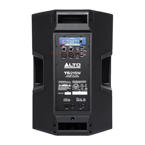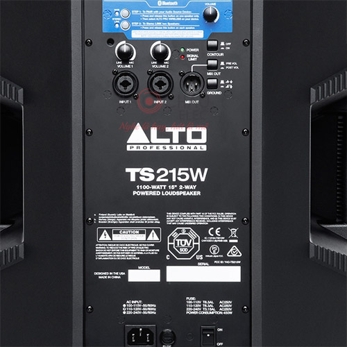 Mặt sau có đầy đủ cổng nguồn, công tắc nguồn, cổng kết nối âm thanh cùng thông số kỹ thuật cơ bản của loa Alto TS215W.