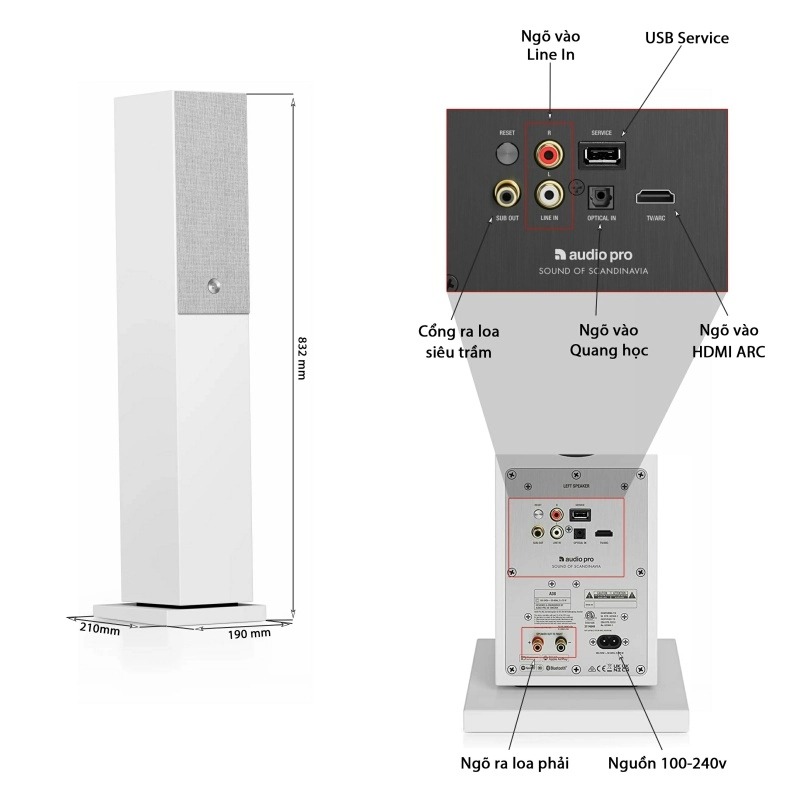 Loa AudioPro A38 trang bị mạch khuếch đại Class D công suất mỗi kênh 75W trong hệ thống âm thanh 2 chiều bao gồm một loa tweeter vòm 2,54 cm (1") và hai loa trầm 11,4 cm (4,5").