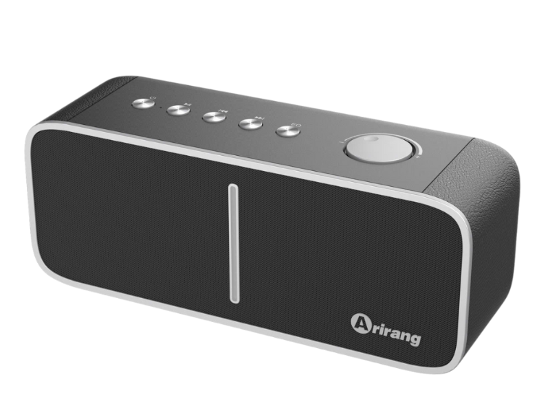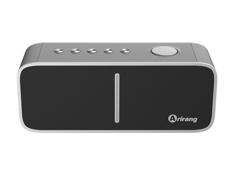 Mặt trước loa là lưới kim loại bền bỉ, có khả năng bảo vệ hiệu quả hệ thống củ loa bên trong, đồng thời hỗ trợ tối ưu khả năng khuếch tán âm thanh ra không gian xung quanh. Logo Arirang được đặt gọn gàng, tinh tế, góp phần tăng nhận diện thương hiệu và tạo điểm nhấn sang trọng cho sản phẩm.