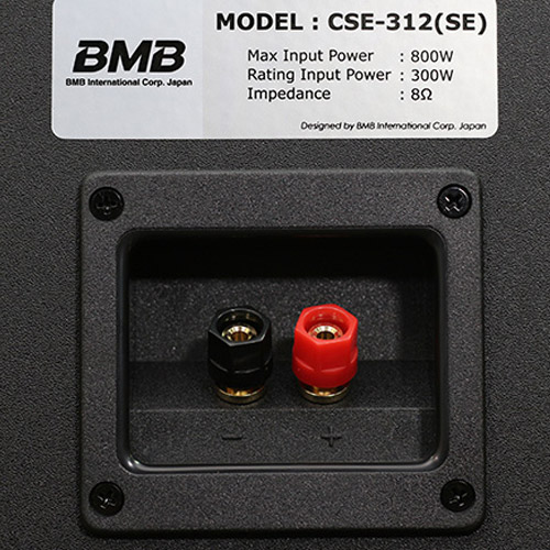Mặt sau của loa BMB CSE 312SE gồm 2 đầu kết nối của loa được phân cực bằng màu sắc, thiết kế vít vặn chắc chắn. Phía trên loa còn được dán tem chính hãng, tem in mã imel và in thông số nguồn điện của loa.