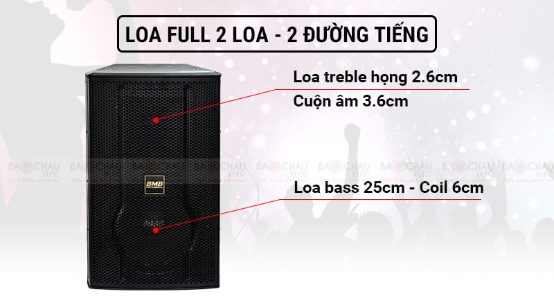 Được cấu tạo gồm 2 củ loa, trong đó có 1 loa bass 25cm và 1 loa treble họng 2.6cm với cuộn dây âm đường kính 3.4cm giúp loa karaoke BMB CSS 3010 cho ra 2 đường tiếng tách biệt, mang đến âm thanh chuyên nghiệp.