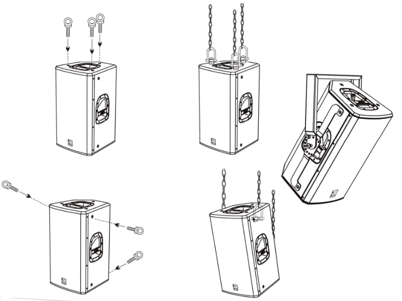 Trong các sân khấu chuyên nghiệp, loa thường được treo bằng rigging hoặc dàn khung truss. Với 12 điểm rigging M8, loa có thể gắn bằng cáp hoặc khung treo chắc chắn, đảm bảo an toàn và định hướng âm chính xác cho không gian lớn.