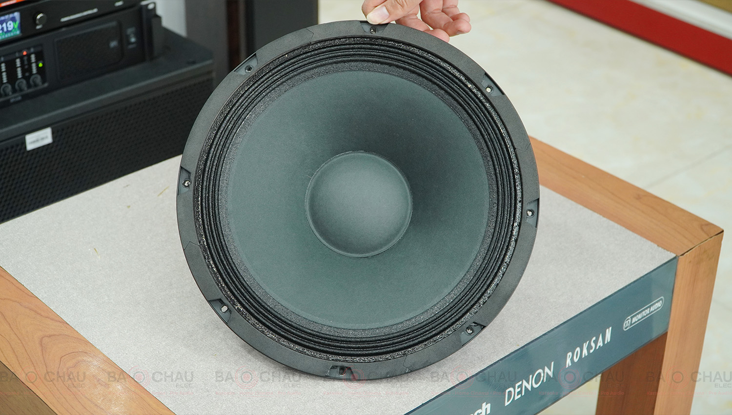 Thùng loa có kích thước tiêu chuẩn 360 mm (rộng) x 610 mm (cao) x 360 mm (sâu), sử dụng chất liệu gỗ ép plywood nhiều lớp giúp tăng cường độ bền và chống cộng hưởng hiệu quả, đảm bảo âm thanh trung thực ngay cả khi hoạt động ở mức công suất cao.