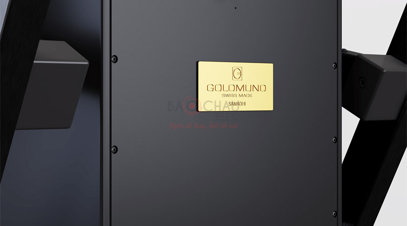 Mặt sau của loa được gắn một miếng kim loại màu vàng, trên nó được khắc tên thương hiệu Goldmund và tên sản phẩm Samadhi cùng logo của hãng tạo điểm nhấn ấn tượng cho sản phẩm.