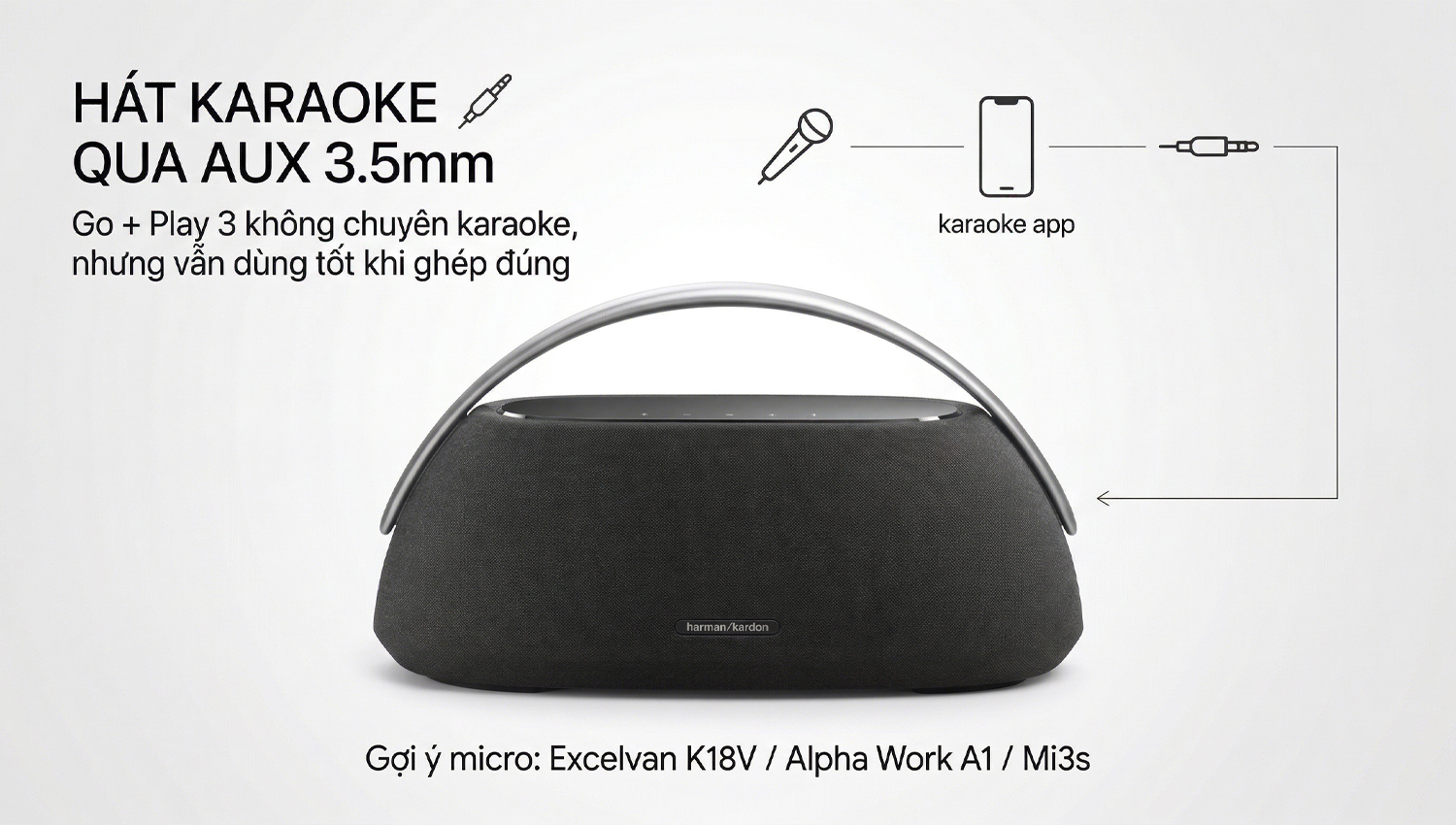 Loa Harman Kardon Go + Play 3 không được thiết kế chuyên dụng cho karaoke, nhưng bạn hoàn toàn có thể tận dụng nó để hát karaoke thông qua cổng AUX 3.5mm. Khi kết nối với micro karaoke phù hợp – ví dụ như Excelvan K18V, Alpha Work A1, hoặc Mi3s – bạn sẽ có thể trải nghiệm giọng hát rõ ràng và mượt mà.