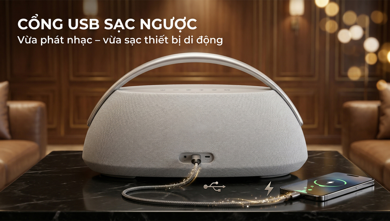 Bên cạnh khả năng phát nhạc ấn tượng, Loa Harman Kardon Go + Play 3 còn được trang bị cổng USB cho phép sạc ngược thiết bị di động. Nhờ đó, người dùng có thể sử dụng loa như một nguồn pin dự phòng tiện lợi, dễ dàng sạc điện thoại, máy tính bảng hoặc các thiết bị thông minh khác trong quá trình nghe nhạc. Tính năng này đặc biệt hữu ích khi sử dụng loa ở ngoài trời, trong chuyến du lịch hay dã ngoại, vừa đảm bảo trải nghiệm âm nhạc liền mạch vừa không lo thiết bị cá nhân bị gián đoạn do hết pin.