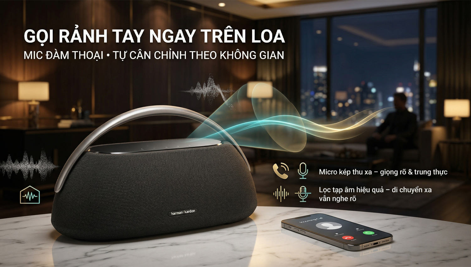 Loa Harman Kardon Go + Play 3 là mẫu loa bluetooth có mic đàm thoại. Với tính năng này, bạn có thể thực hiện cuộc gọi rảnh tay ngay trên loa. Hệ thống sẽ tự động điều chỉnh âm thanh sao cho phù hợp với không gian xung quanh, mang lại trải nghiệm giao tiếp và nghe nhạc mượt mà.