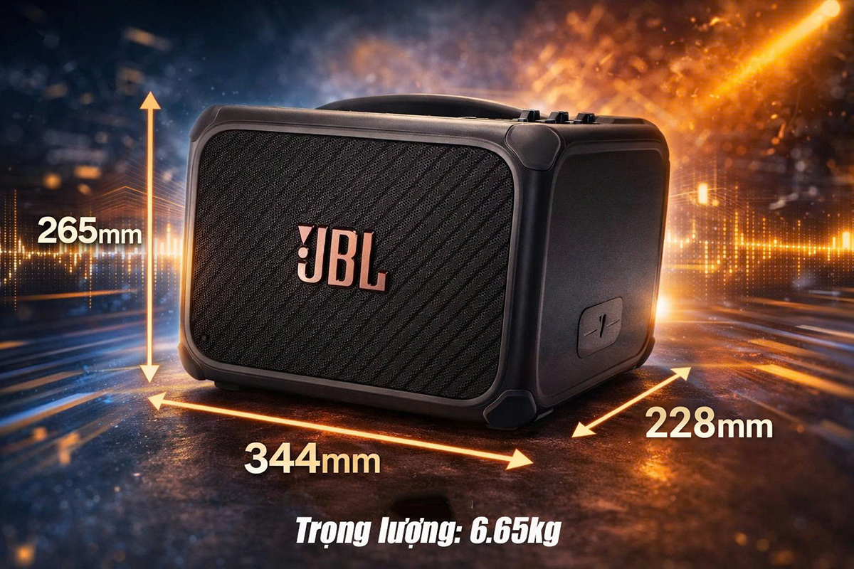 Loa JBL BandBox Trio sở hữu thiết kế gọn gàng nhưng đầy chắc chắn, phù hợp cho cả luyện tập trong phòng thu nhỏ lẫn biểu diễn di động. Với kích thước 344 x 265 x 228 mm và trọng lượng chỉ 6.65 kg, người dùng có thể dễ dàng di chuyển, bố trí hoặc mang theo đến các buổi jam, biểu diễn ngoài trời hay phòng tập cá nhân.
