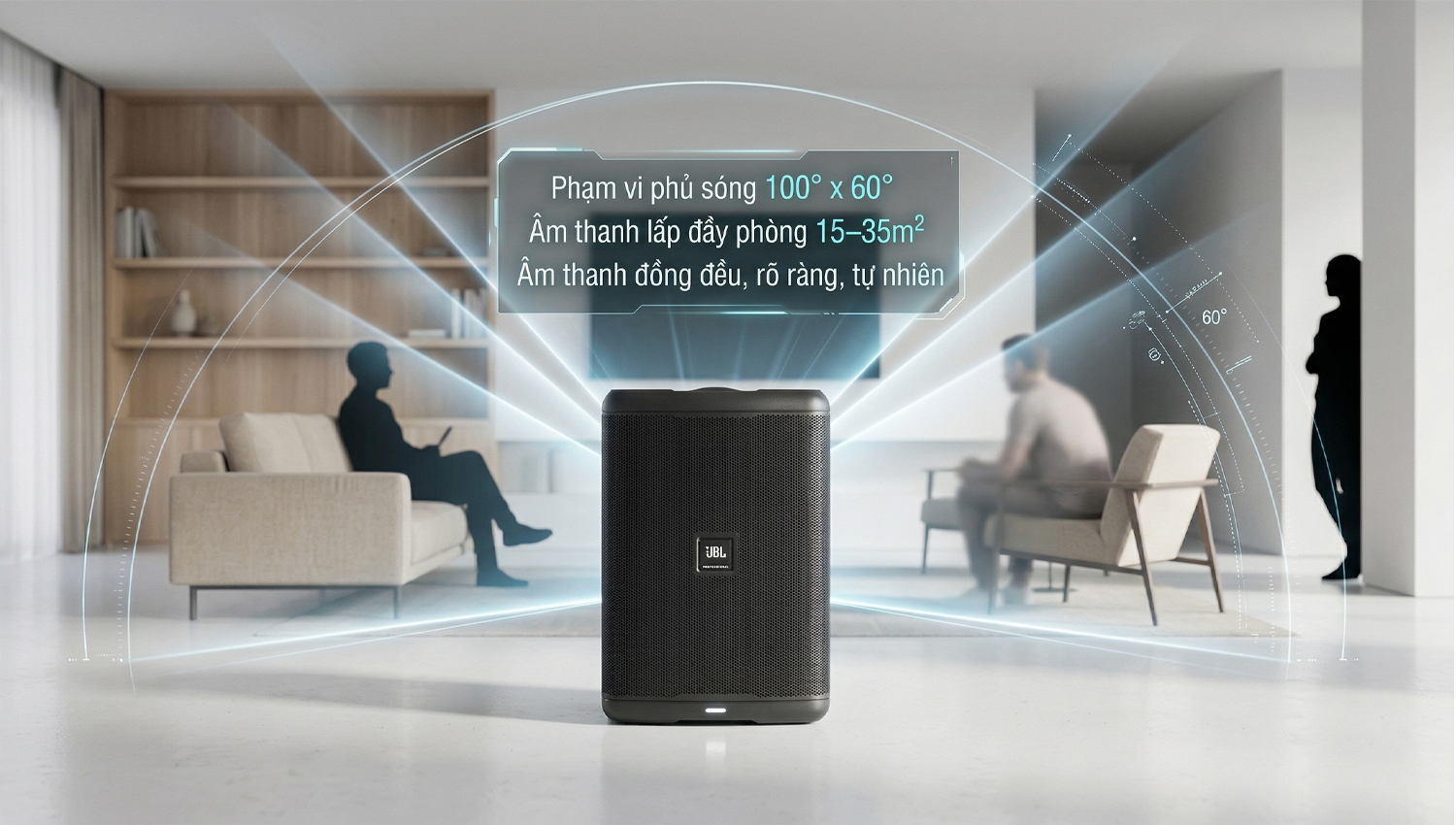 Bên cạnh đó, góc phủ âm 100° x 60° giúp âm thanh lan tỏa đều khắp không gian, đảm bảo mọi người trong phòng đều nghe rõ ràng, chân thực ở mọi vị trí.