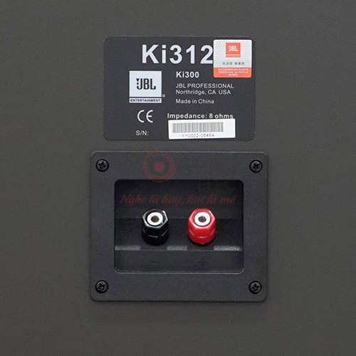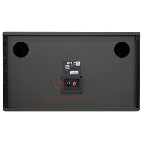 Mặt sau của loa JBL Ki312 ba sao có hai đầu kết nối loa 2 mầu đen, đỏ. Bên trên là tem phụ của hãng JBL thông báo về phần công suất cũng như thông số của loa.