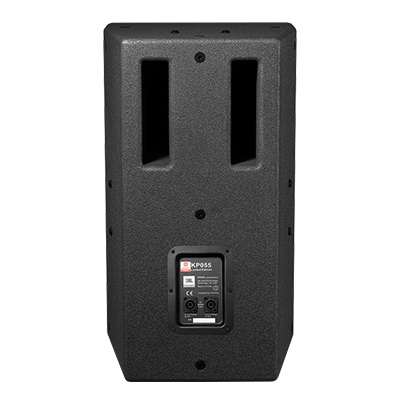 Mặt sau loa JBL KP052 gồm cổng kết nối, thông số kỹ thuật cùng 2 lỗ thông hơi cỡ lớn hình chữ nhật dọc.