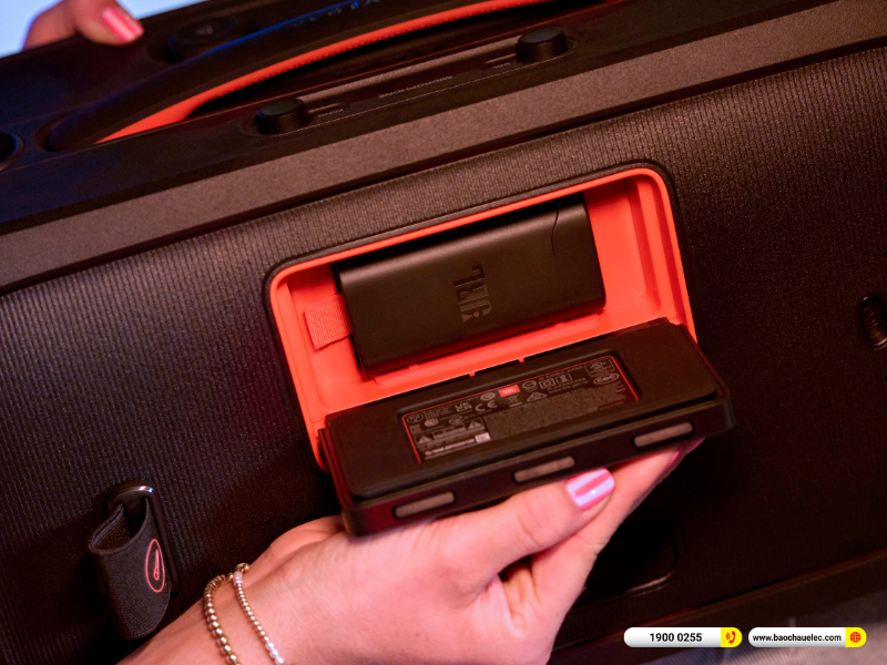 Một điểm cộng lớn là loa hỗ trợ thay pin rời (JBL bán riêng). Điều này giúp kéo dài tuổi thọ sản phẩm, đồng thời phù hợp cho các buổi cắm trại hay sự kiện kéo dài nhiều giờ liên tục.