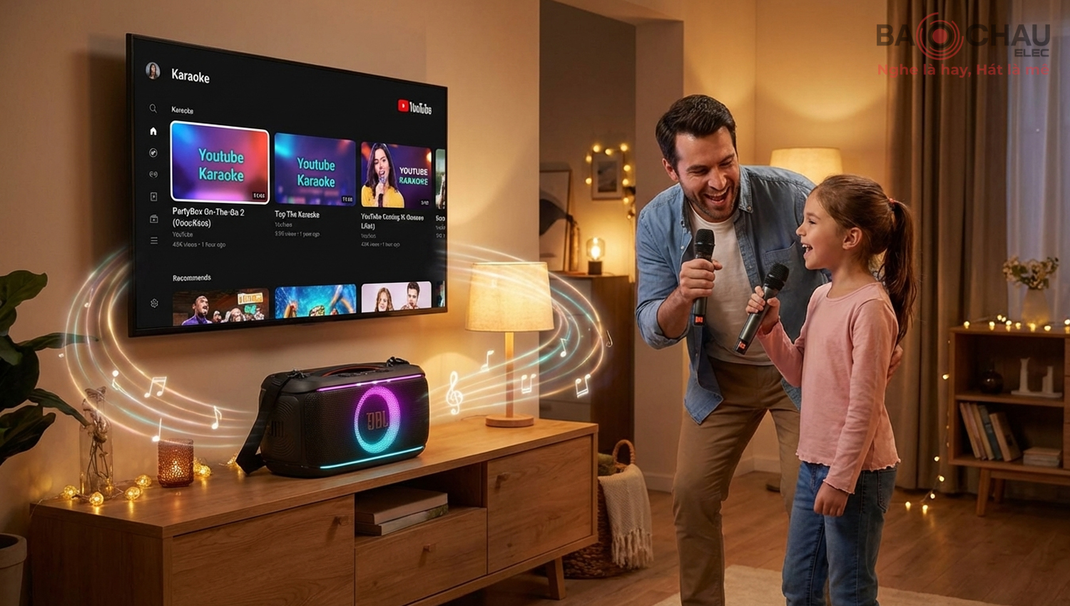 - Hát karaoke gia đình sum vầy "Tất cả trong một" (All-in-one) ngay tại phòng khách. Bạn có thể kết nối loa với Smart TV qua Bluetooth để hát karaoke trên Youtube hình ảnh sắc nét, hoặc đơn giản là phát những bản nhạc nền du dương trong các bữa tối thân mật của gia đình.
