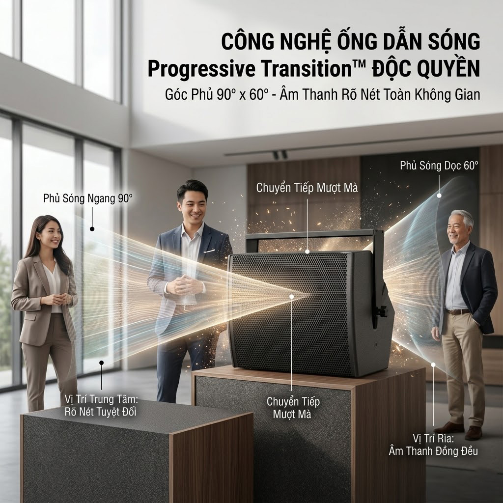 Ống dẫn sóng này có góc phủ 90° x 60°, giúp âm thanh được phân bổ đều trong không gian nghe. Công nghệ Progressive Transition™ đảm bảo sự chuyển tiếp mượt mà giữa các dải tần, đồng thời duy trì độ rõ nét và độ chính xác của âm thanh trên toàn bộ khu vực phủ sóng.